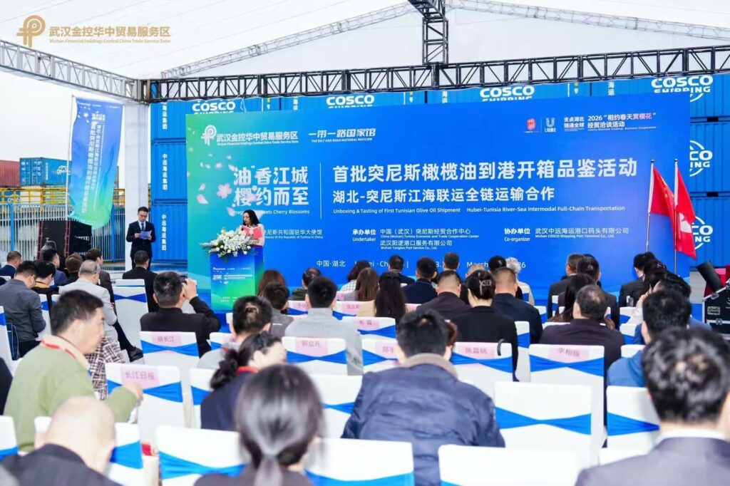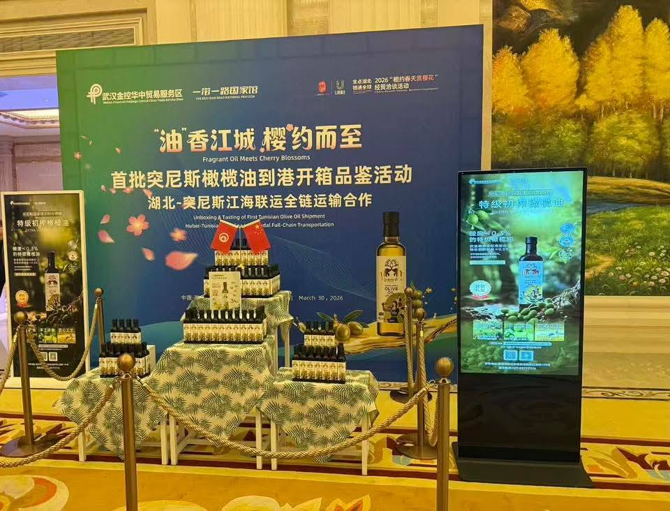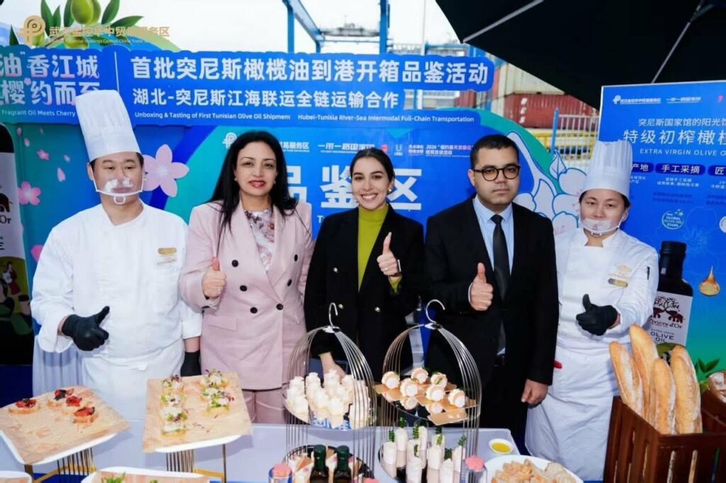 L’Ambassade de la République tunisienne à Pékin a organisé, hier lundi, une manifestation économique au port de la province chinoise du Hubei, en collaboration avec l المؤسسة يوهان يانغلوو, à l’occasion de l’arrivée, pour la première fois dans ce port, d’une cargaison d’environ 50 tonnes d’huile d’olive tunisienne.
