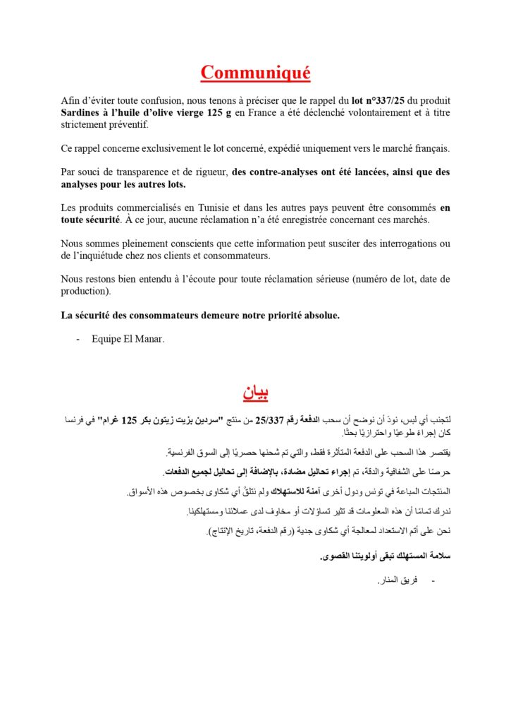 من جانبها، أكدت شركة “El Manar” أن السحب تدبير احترازي يطال فقط هذا الـ lot المعني في فرنسا، مشددة على أن المنتجات المباعة في تونس والدول الأخرى آمنة ولم تُسجّل عنها أي شكاوى حتى الآن. وأوضحت الشركة أنها أطلقت تحاليل إضافية للتأكد من جودة باقي الإنتاج.