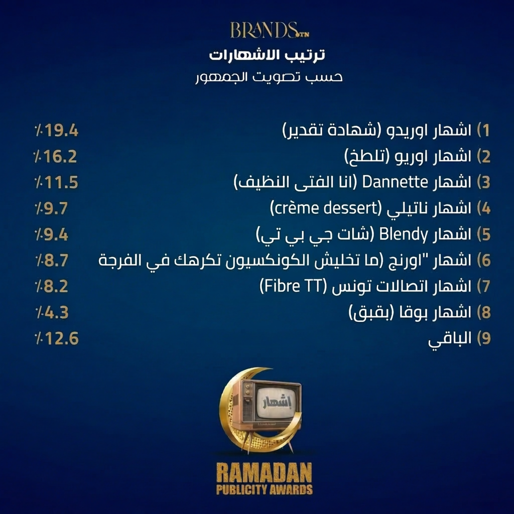 من خلال هذه النتائج يتوج اشهار شركة اوريدو “شهادة تقدير” بجائزة احسن اشهار لرمضان 2026 وذلك من خلال تصويت متابعي موقعنا Brands.tn.